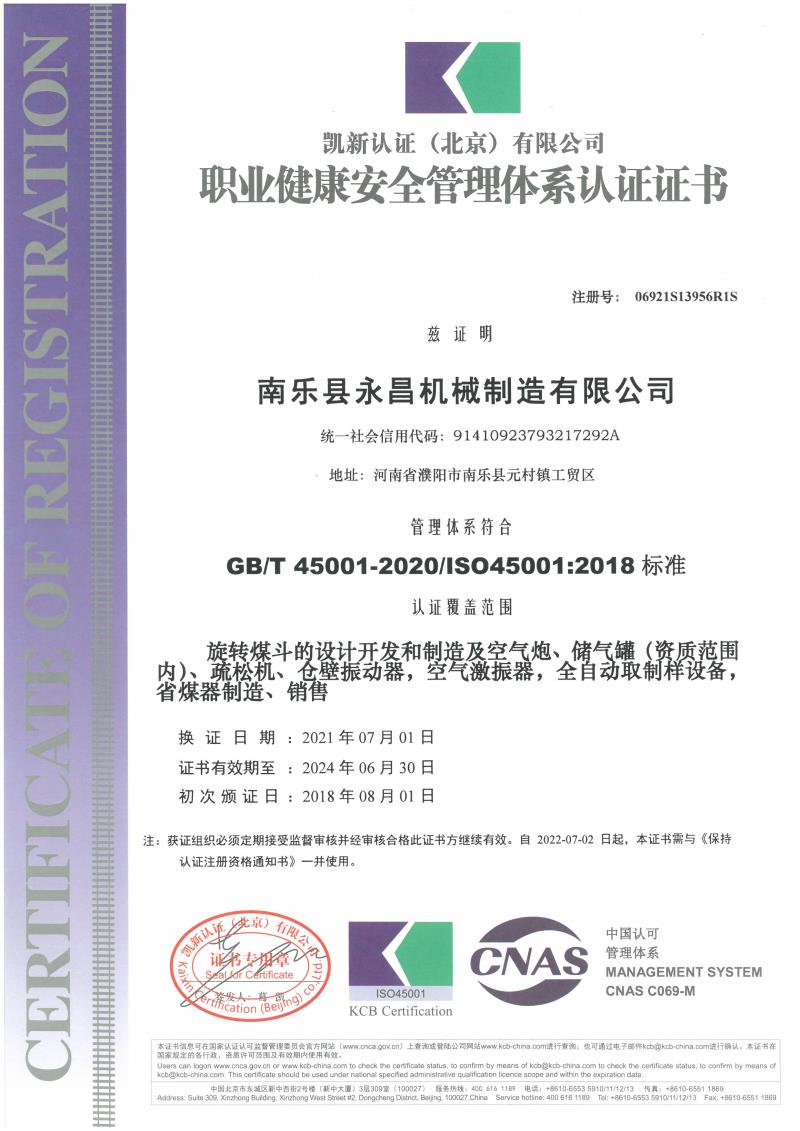 职业健康安全管理体系认证证书